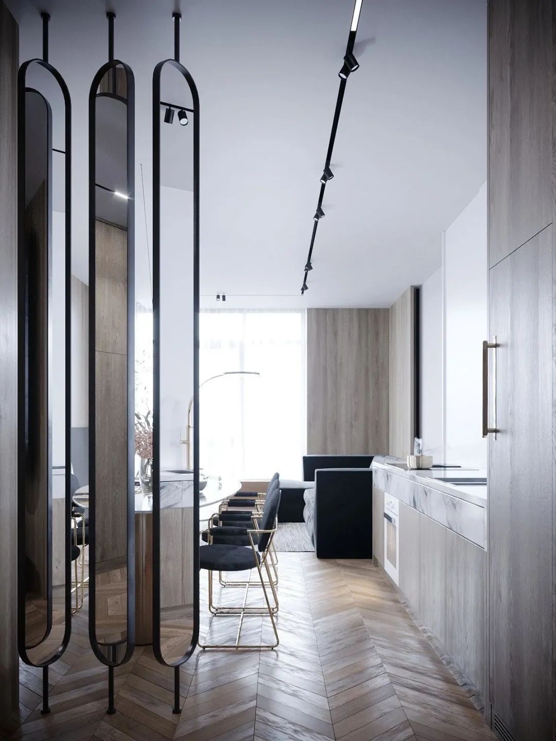 设计师在设计时使用了精致的家具与干净的线条,选用天然材质搭配金属,打造出精致现代风小宅。