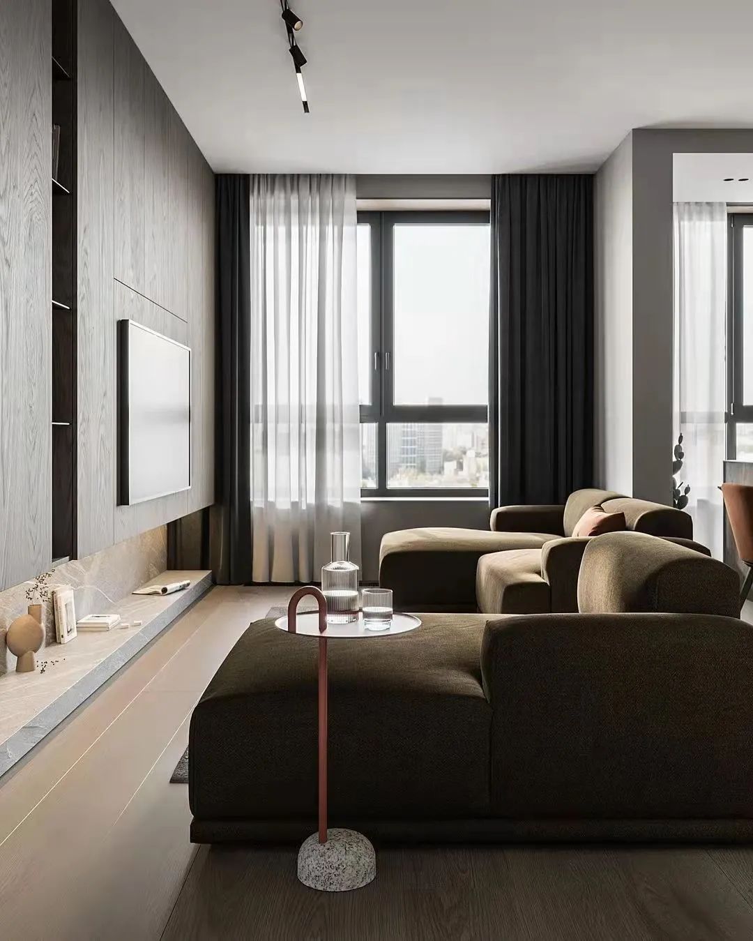 进入房间,简单的布置也是匠心独运,落地镜开阔空间,橘色的吊灯为归来的主人带来一丝抚慰。