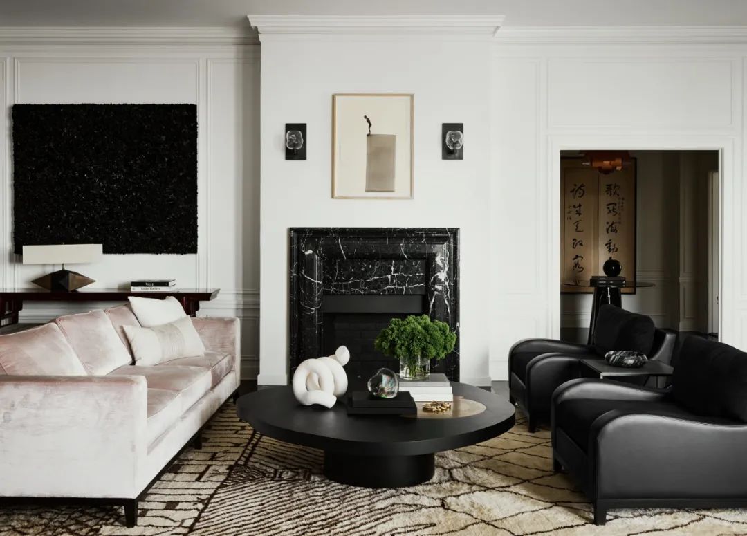 客厅内以基础的黑白色为主色调。同时又不受黑白色的约束,暖色调的地毯与婴儿粉的绒面沙发调节了公寓内的气氛,庄重的同时又不失轻盈活力。