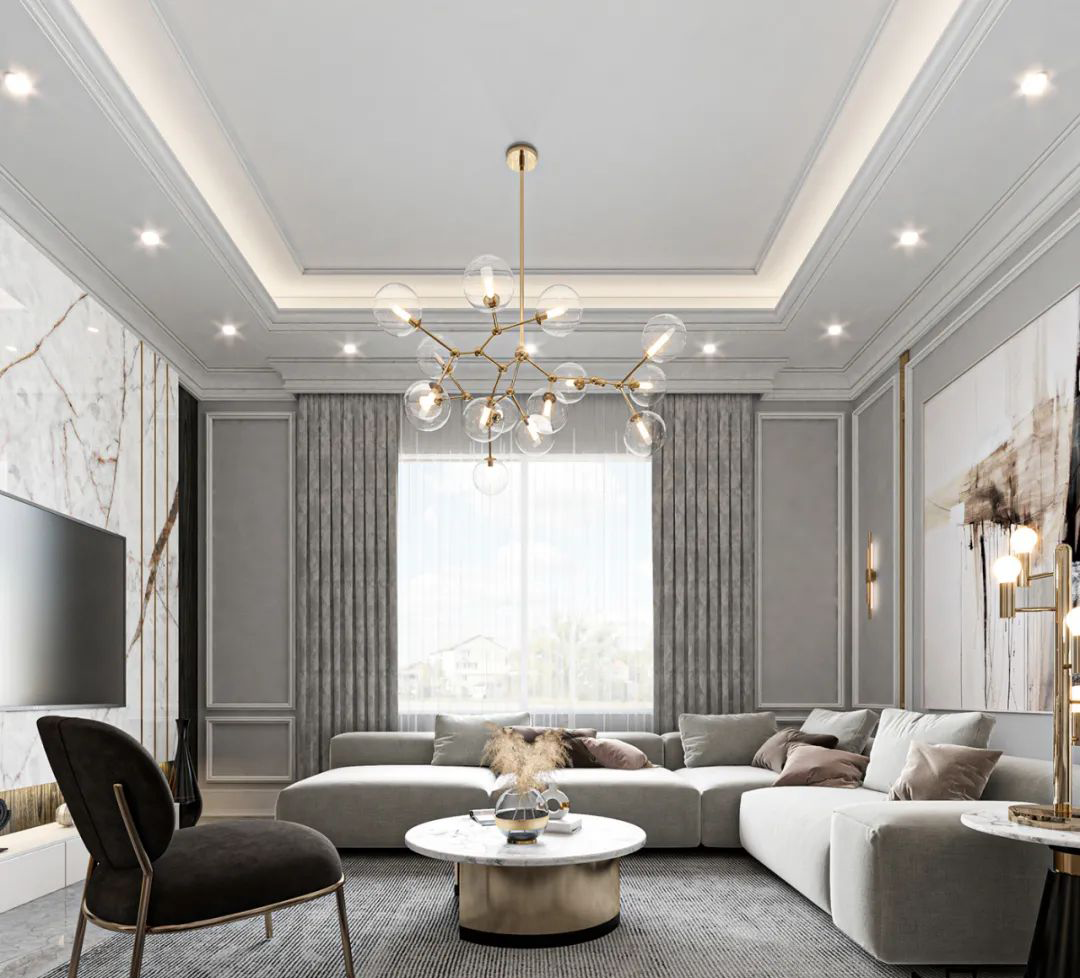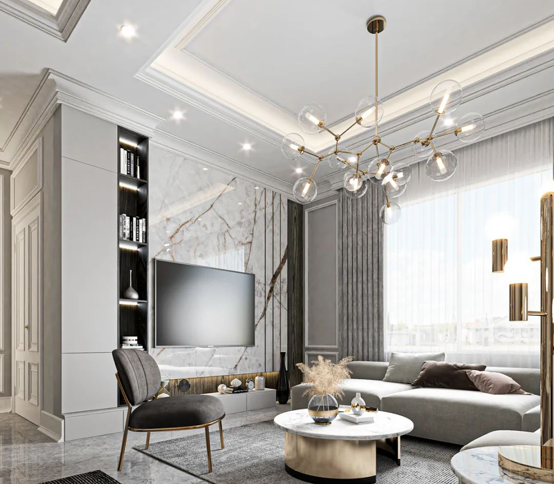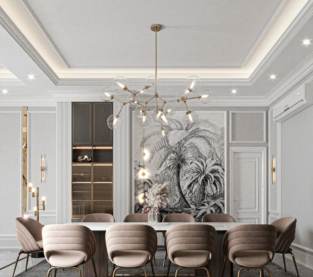 餐厅除了餐椅用了朱砂红色外,几乎全为白色的饰面,营造干净、雅致的氛围,细节之处用金属元素来打造立面的局部设计,让空间层次更为充实。