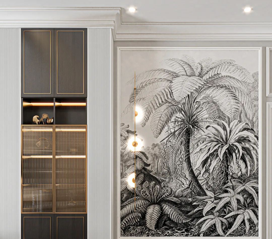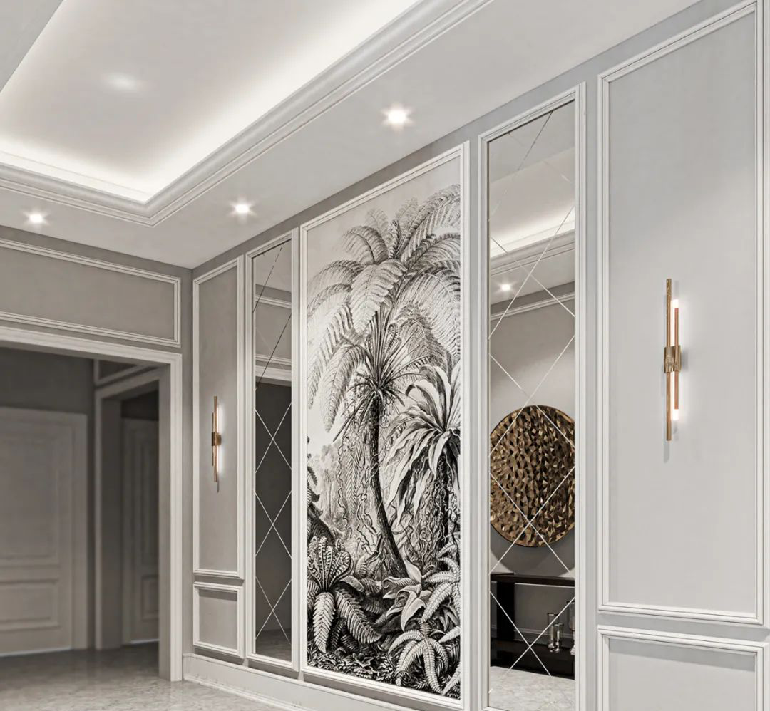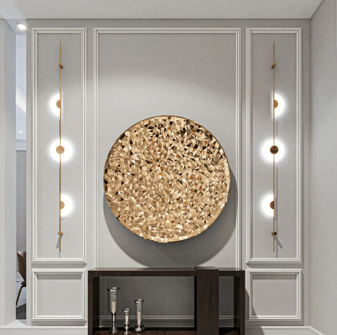 廊道的设计颇具艺术质感,设计师用一面大金属圆盘来作为主角,游弋在过道中,对面则是一幅大型水墨画,带有些许东方余韵。