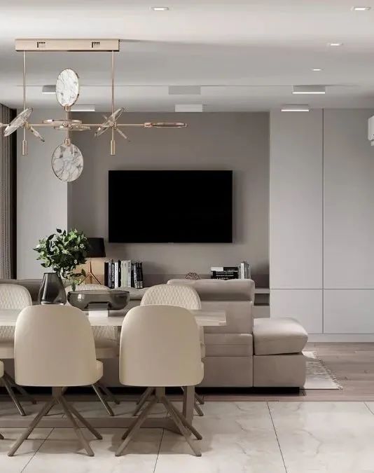 餐桌位于沙发的正后方,不仅增加了空间的互动性,也让生活氛围变得更加融洽温馨。Nebula吊灯与Maytoni的嵌入式灯不同寻常的设计提高了空间的品质感,让人眼前一亮。