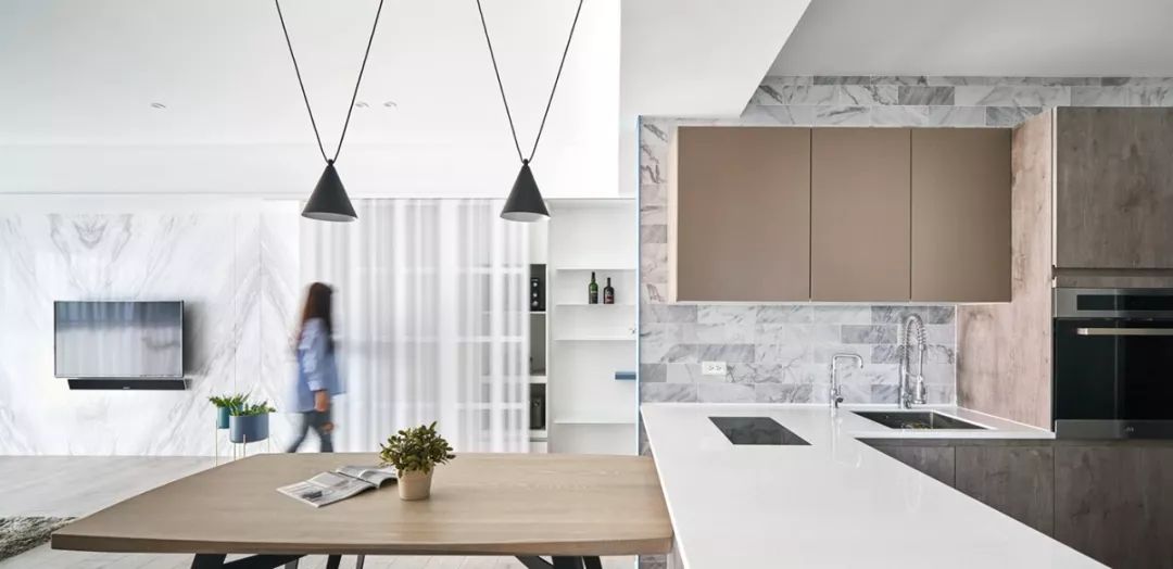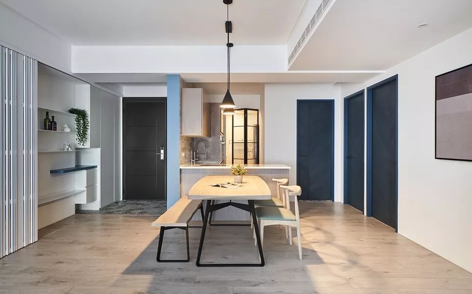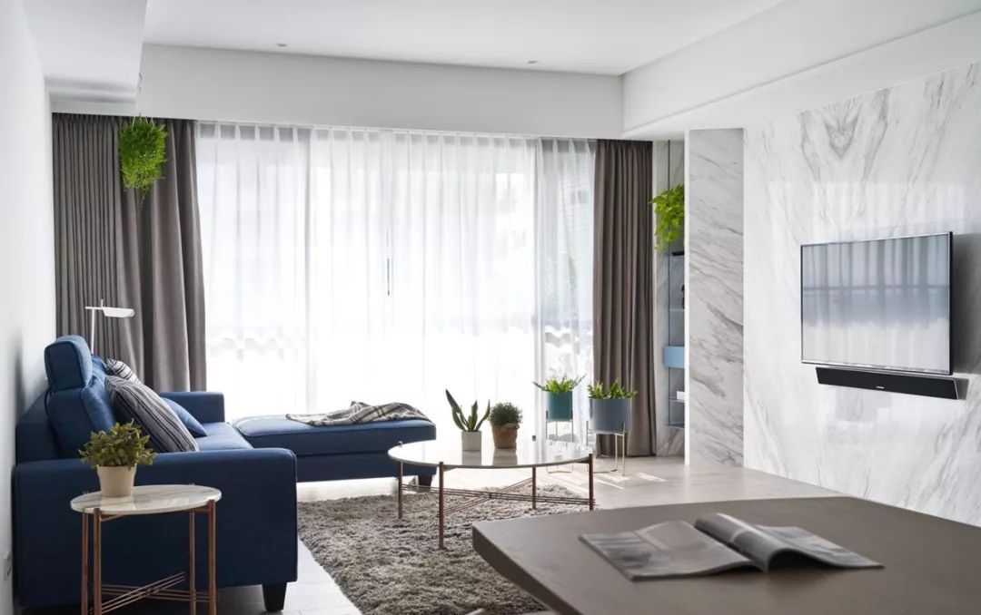 现代简约白色基调、配上蓝色的沙发,木质的地板,时尚清新自然,加上设计师独特的品味,才能涵养出专属于居住者的生活风格。那已经不单是视觉美感的铺陈,而是要让空间活起来。
