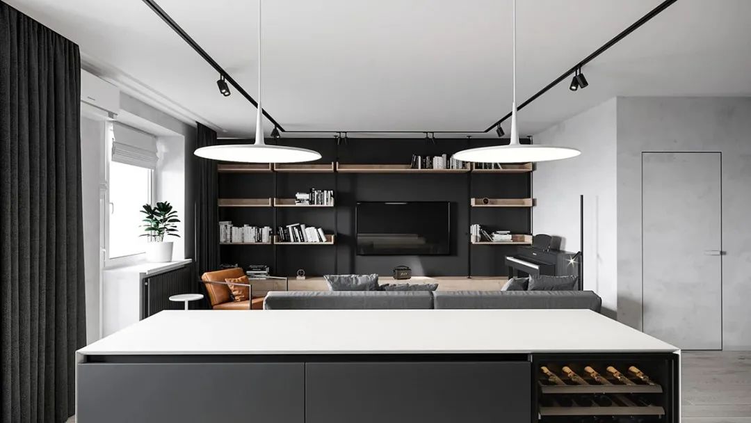餐厅与厨房位于同一空间,设计别出心裁。不同高度的双台面中岛台,让其拥有用餐与操作的双重功能,既美观又实用。白色中岛台与后方的深灰色橱柜,形成了颜色上的对比,打造出了空间的深邃感与高级感,丰富了空间的层次。