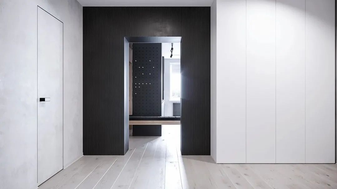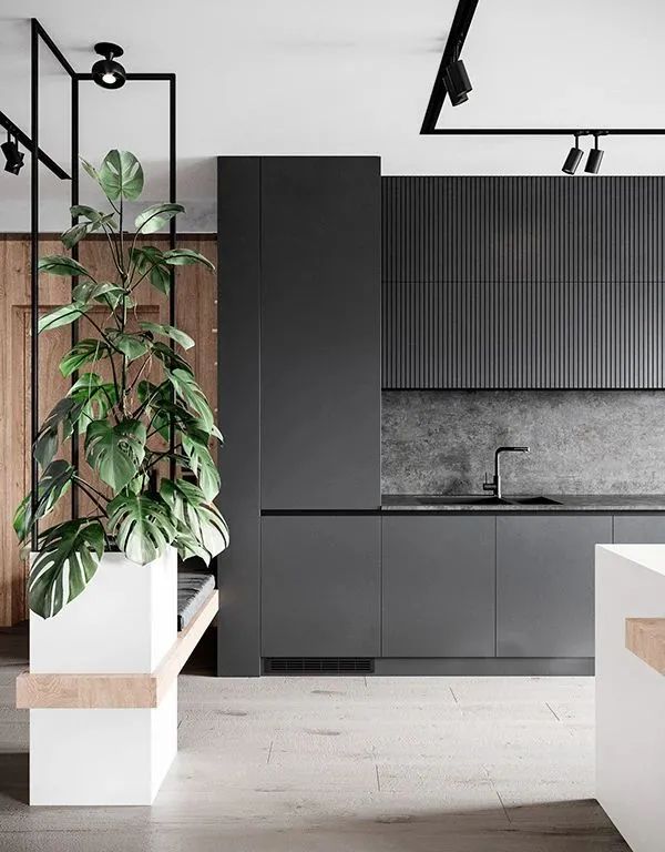 设计师利用高级灰的配色,在简约现代的空间中打造出高级质感。再加上原木材质与绿色植物的点缀,打造出了现代都市生活下简练与优雅的生活氛围