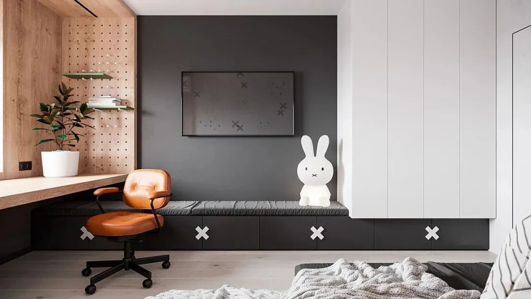 儿童房的设计中,除了使用了高级耐看的黑白灰配色,还加大了橙色的面积,为空间带来了活力感。