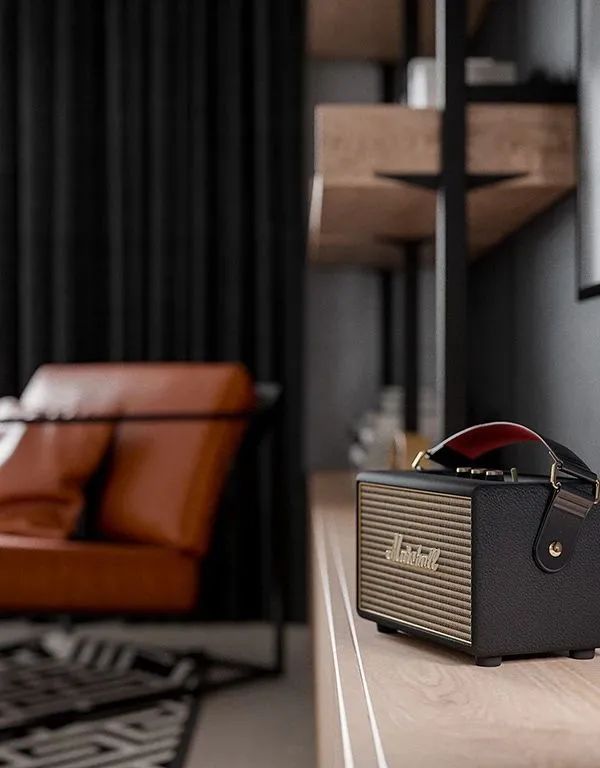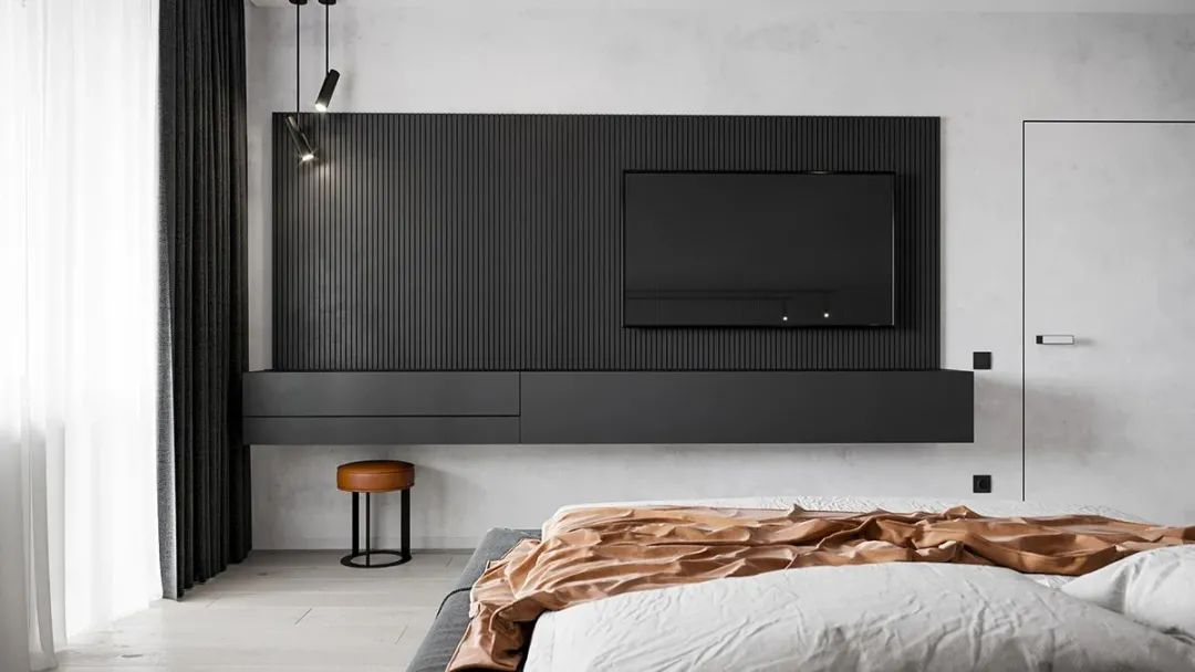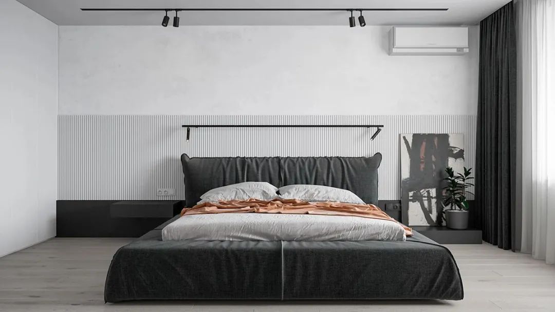 主卧依旧是延续黑白灰的高级配色,将简约的手法与高级的色调融合??占渲欣涞南咛?,展现出现代极简主义下的几何美感?;疑档拇财反钆渖弦荒窖鄣某壬?,为空间带来活力,打造出了一个温馨舒适的休憩空间。