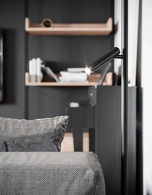 客厅处,设计师使用了开放式设计,营造出宽敞开阔的视觉感受。利用灰色的布艺沙发搭配格纹毛绒地毯,奠定空间整体的沉稳高级基调。黑白灰的合理运用让空间的色调和谐统一。阅览区处的原木材质,点缀了整体黑白灰的空间,让空间更加通透。