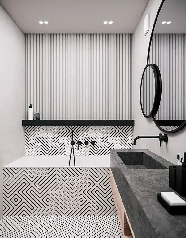 卫生间的设计时尚而高级,空间中的简约线条,现代而高级。深灰色台盆与木色柜体相互融合,形成了色彩上的对比。圆形的梳妆镜,造型简洁而不失美感。
