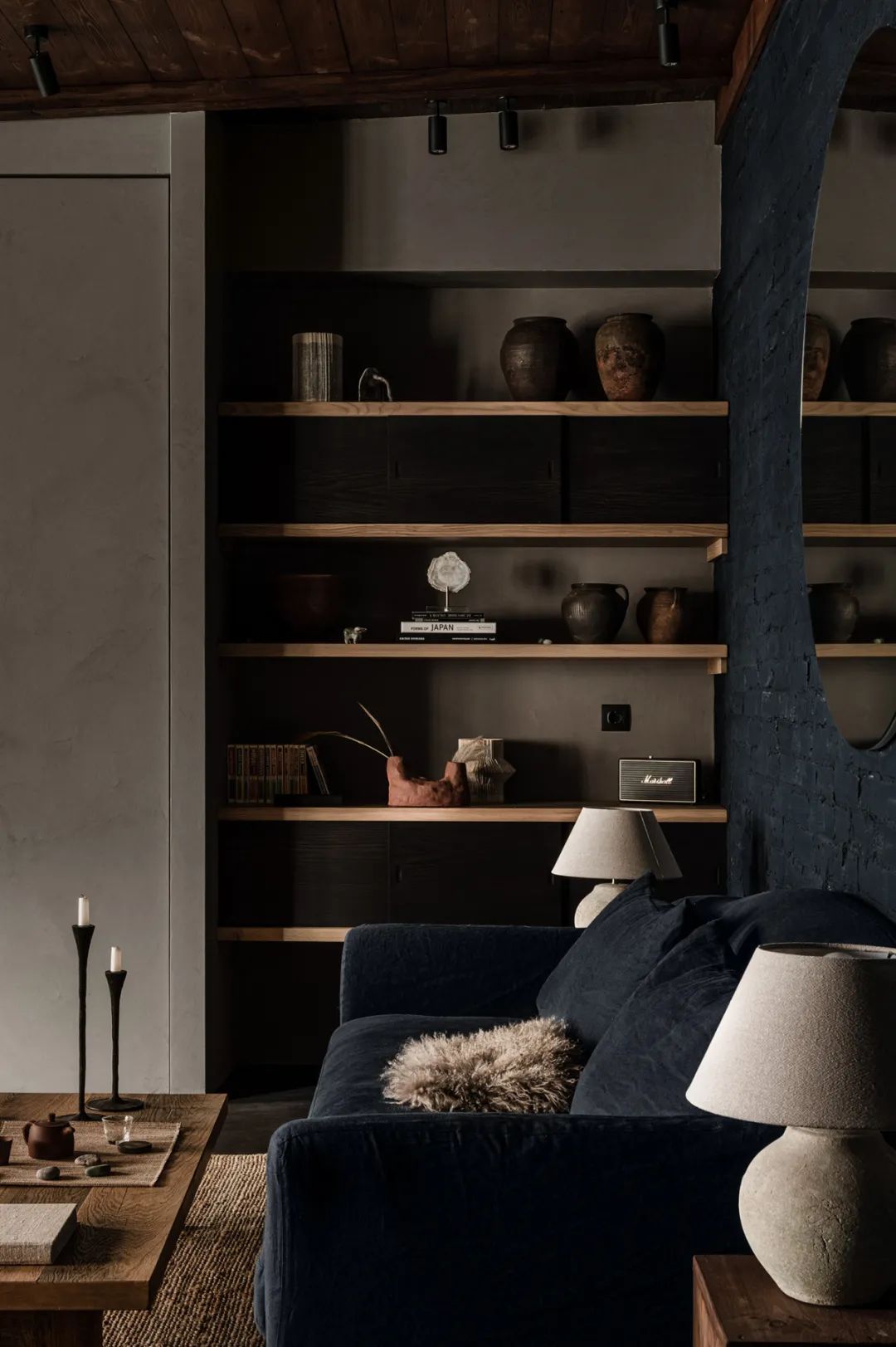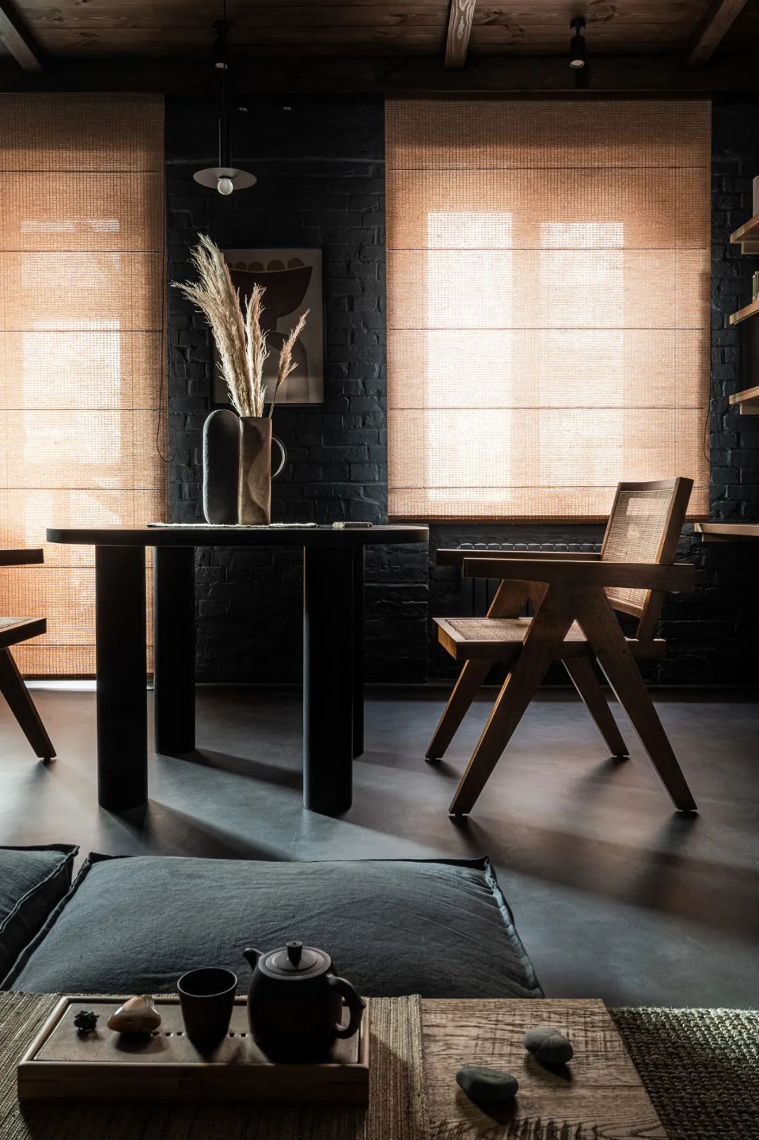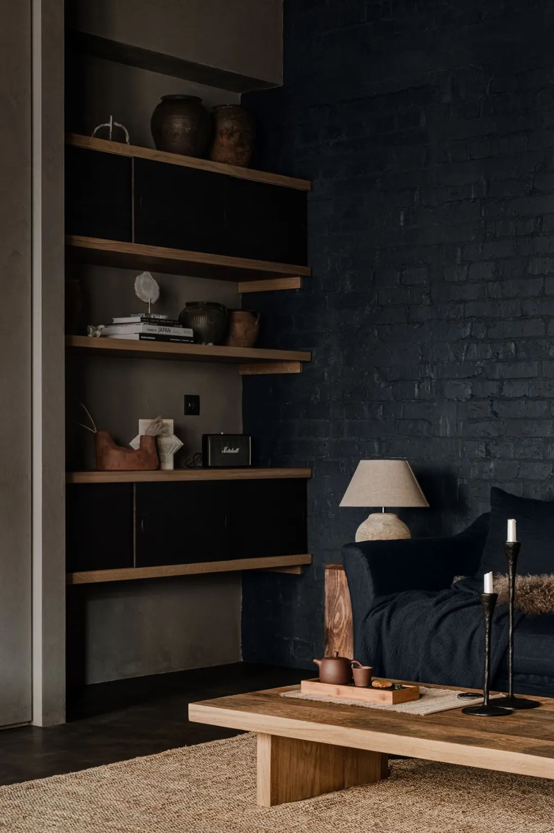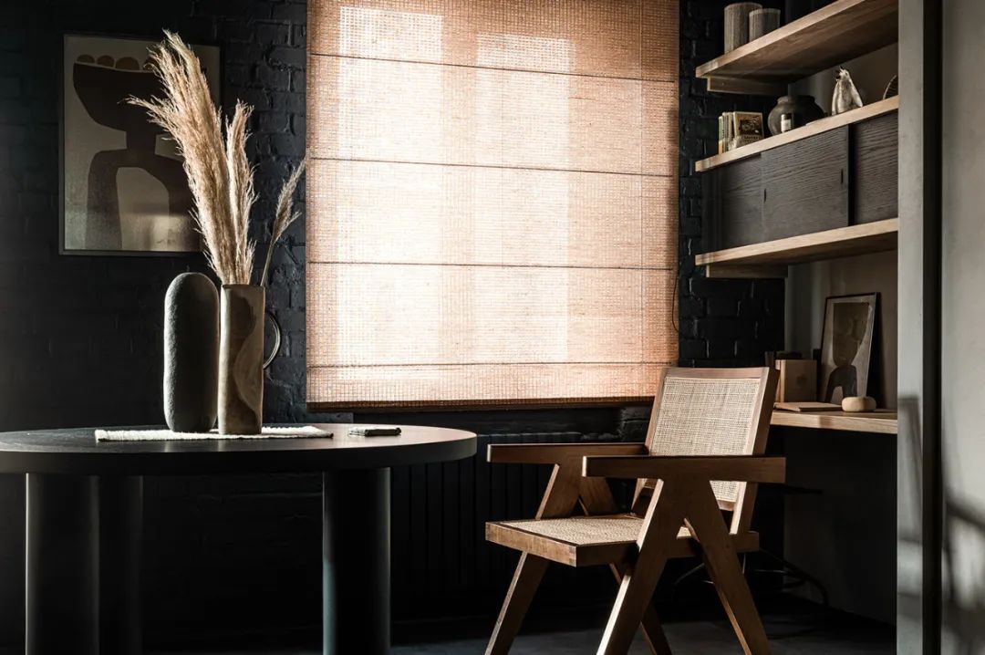 整个室内以暗色系为主,黑色的砖墙布满了每一处角落,虽然暗沉却毫不压抑,身处在这个空间可以让人由内而外的散发出一种安心感。