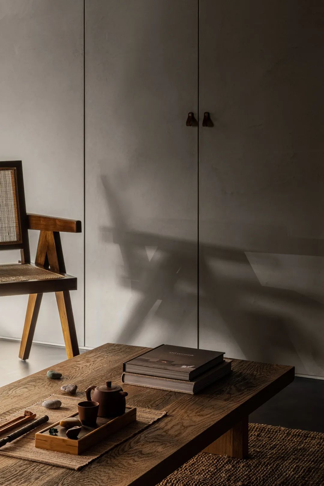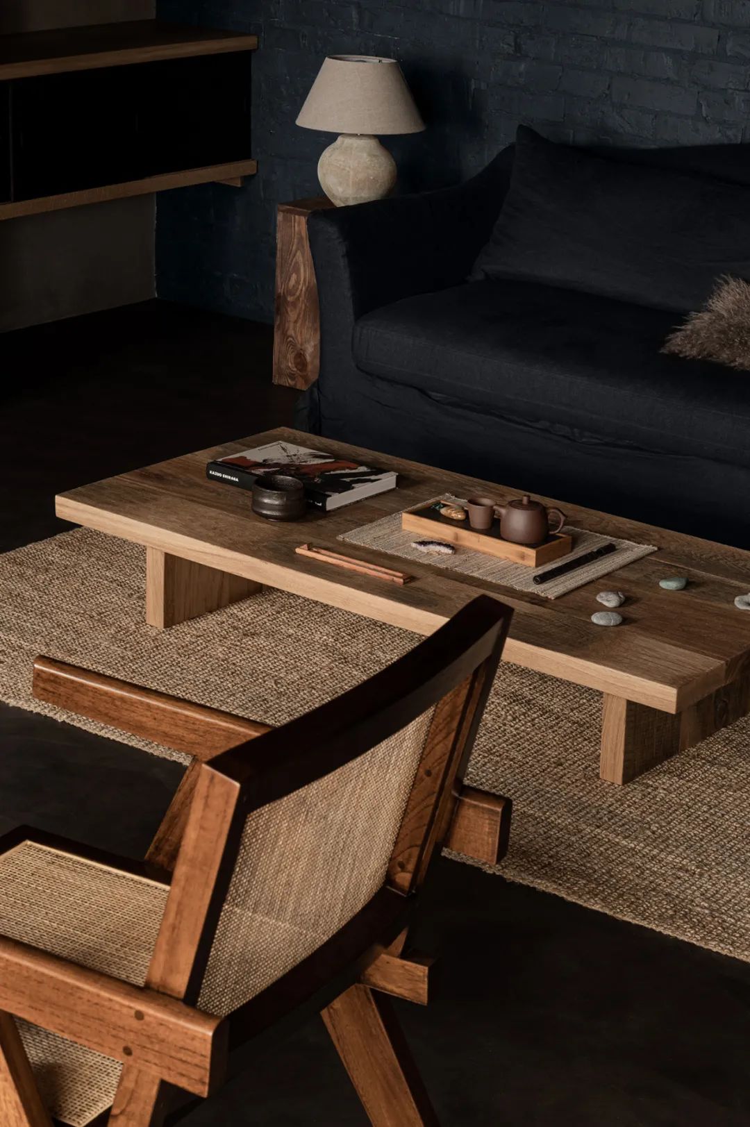 藤编的座椅和木质的茶几给整个空间增添了一丝“禅”的味道,搭配边上麻布质地的灯罩,让空间增添了不少韵味。