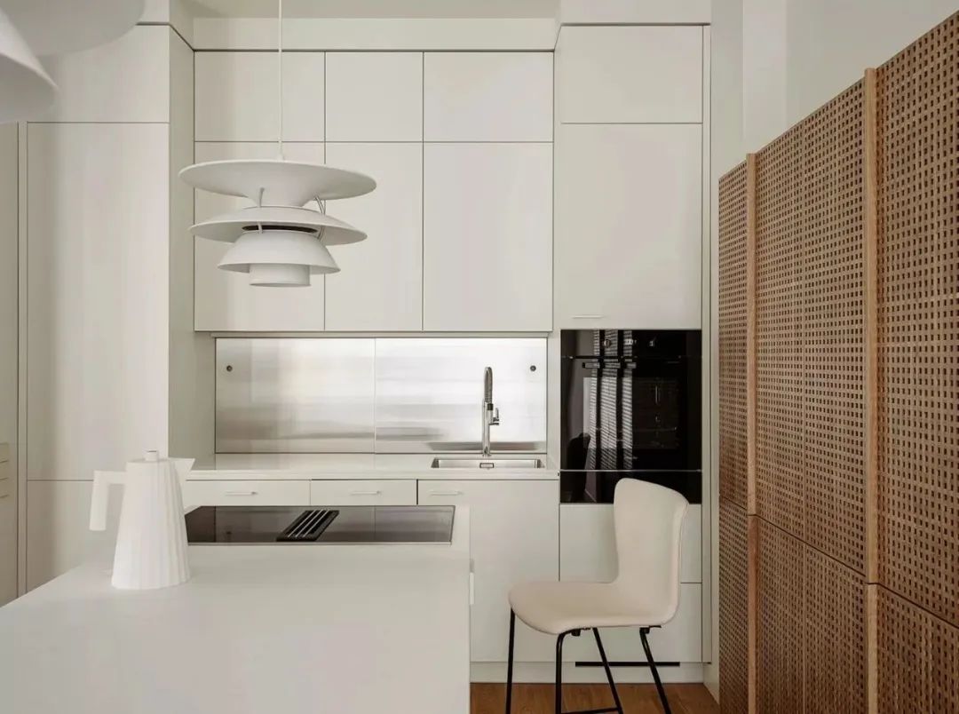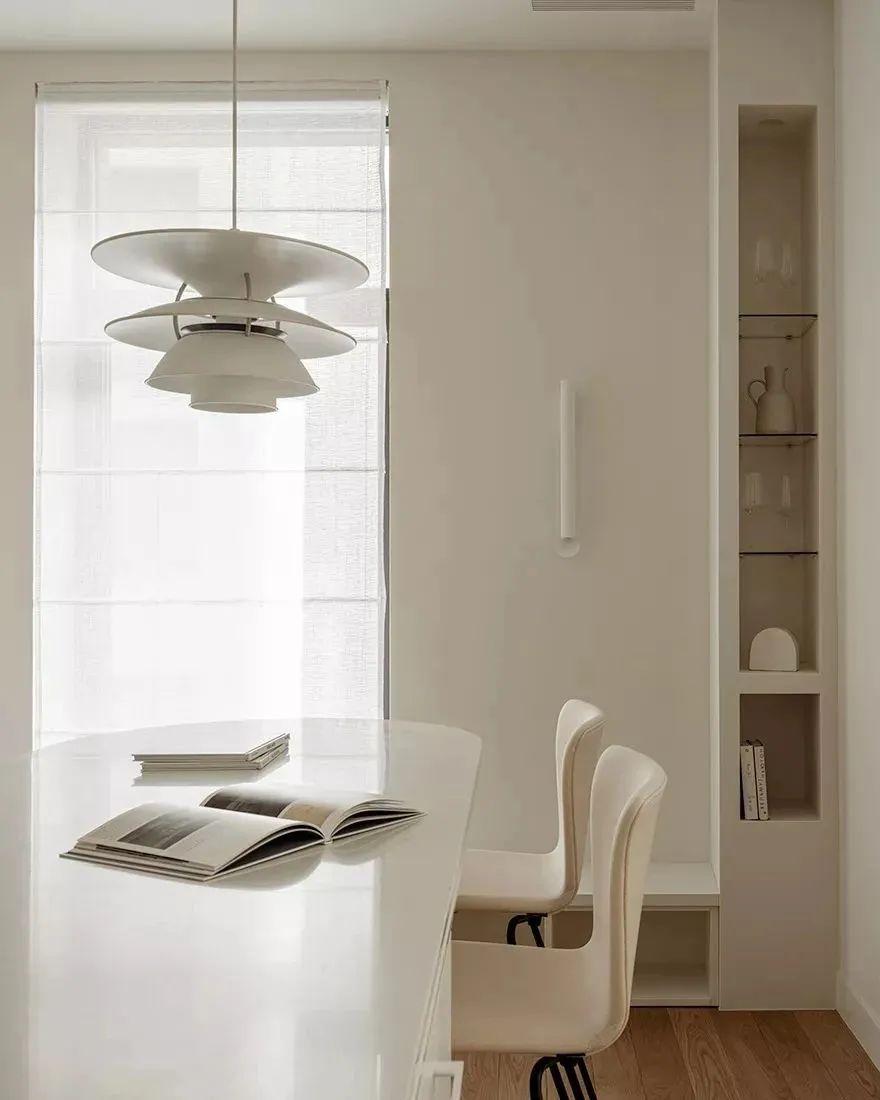 厨房与餐厅位于同一空间,白色的软装家具让空间更显明亮宽阔,中岛台与餐桌相连接,很好地利用了不大的空间。餐桌上方的白色吊灯富有设计感,兼具美观性与实用性。桌面上摆放着黑色的装饰摆件,与整体空间形成了色彩上的对比。