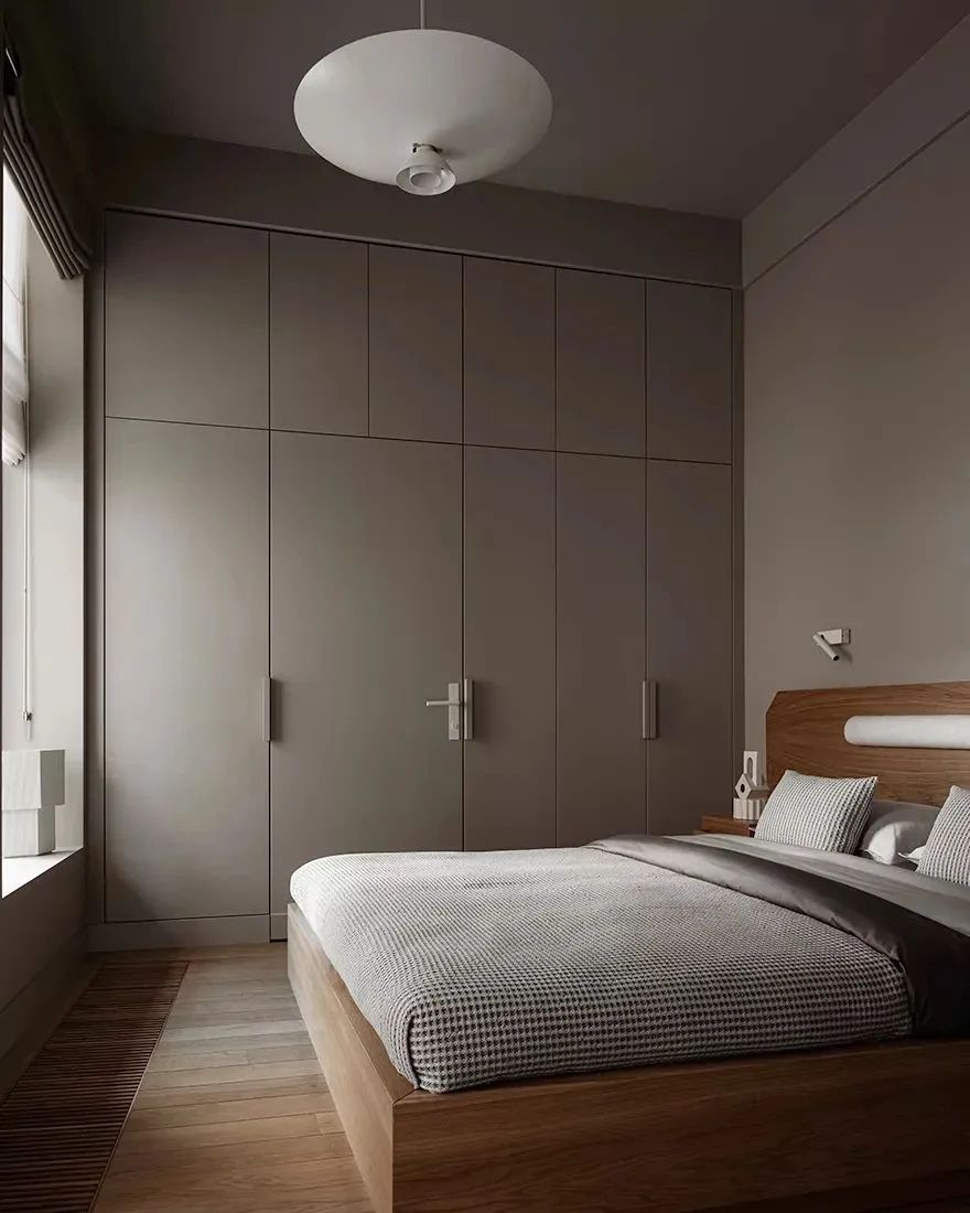 卧室经过精心布置,显得大方简洁又极具现代感。浅灰色与原木色的搭配让空间的整体氛围更显静谧。木质床头柜上摆放着几何组成的摆件,运用物质技术手段和建筑美学原理,创造功能合理、舒适的室内环境。