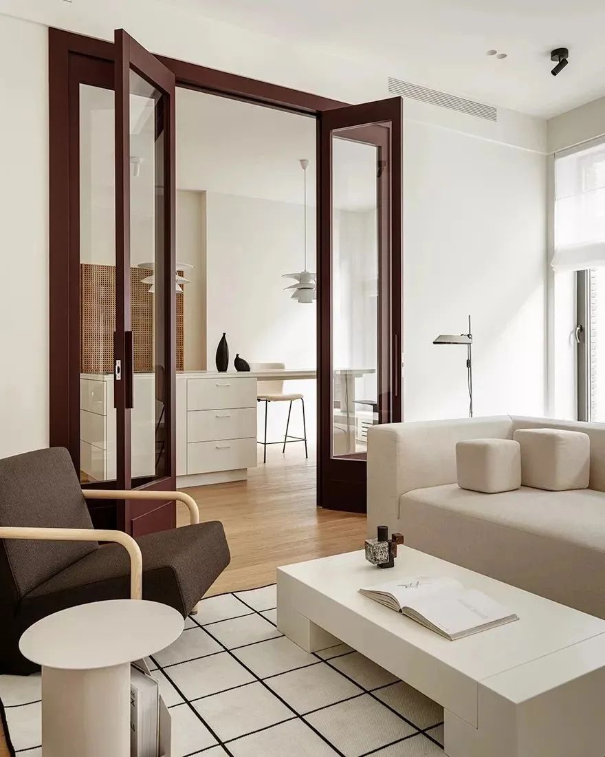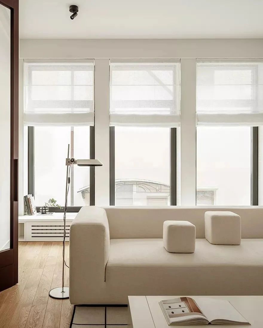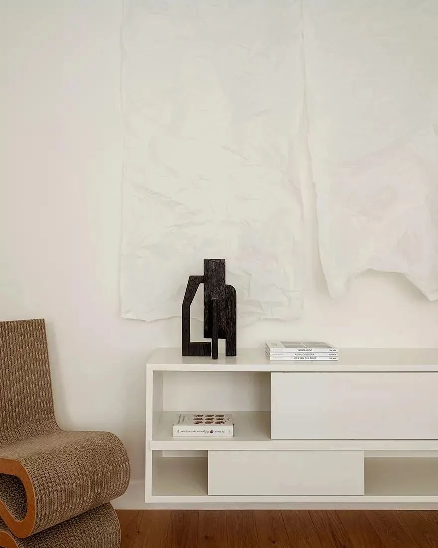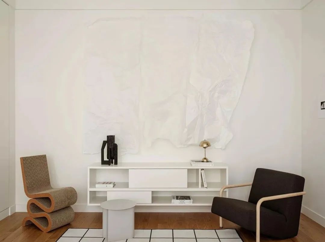 设计师将公共区域与私人区域很好地划分开来,不同材质的搭配让空间的质感更加丰富??吞?,原木材质的地板营造出富有美感的自然氛围。造型简洁的白色布艺沙发与白色茶几相搭配,显得高级而耐看,深色的扶手椅点缀了空间,也丰富了空间的层次。