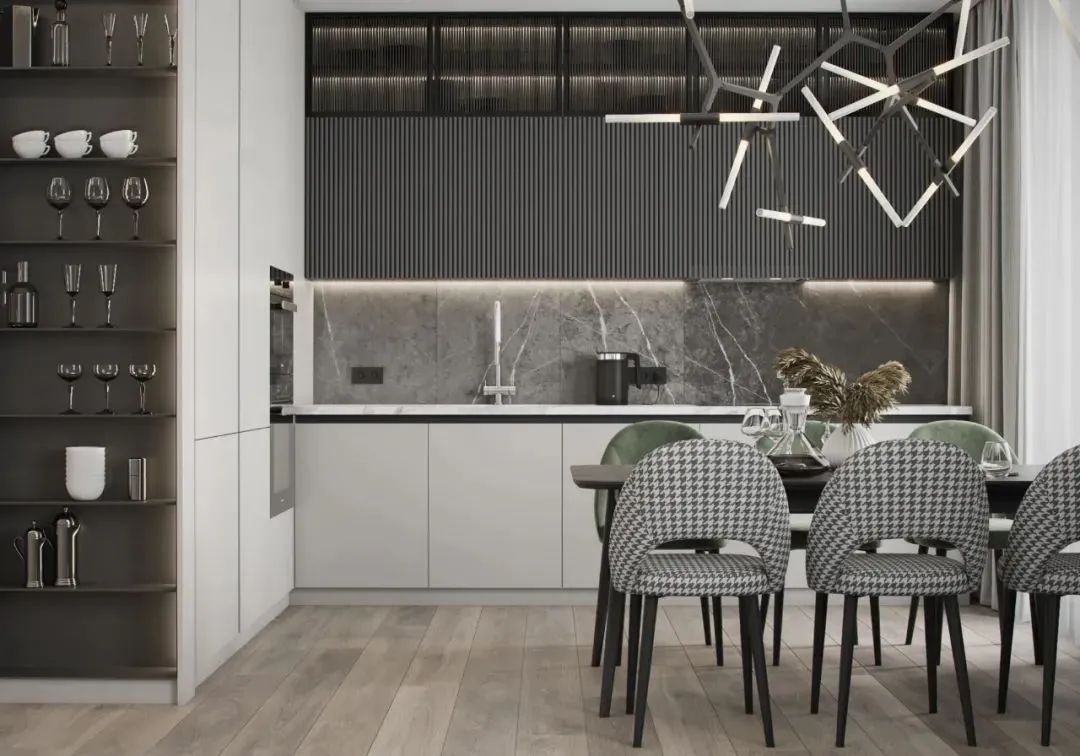 客厅和厨房、餐厅一体化的设计,让整个视觉空间看起来更加宽广。餐桌上方造型感十足的灯饰成为了整个空间的亮点,相互交错的时尚设计带来强烈的视觉效果。