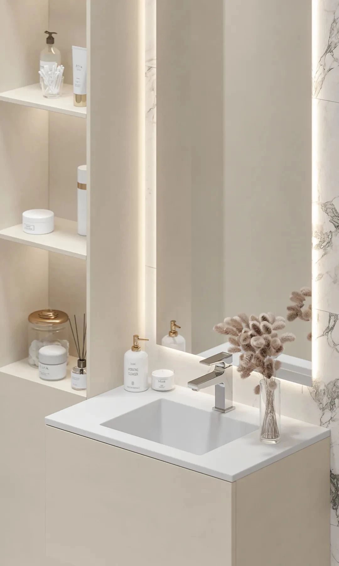 卫生间依旧延续了整体的设计风格,干湿分离的设计给人舒适的使用感受,兼具美观性与实用性,简洁的洗手台与橱柜,十分耐看。