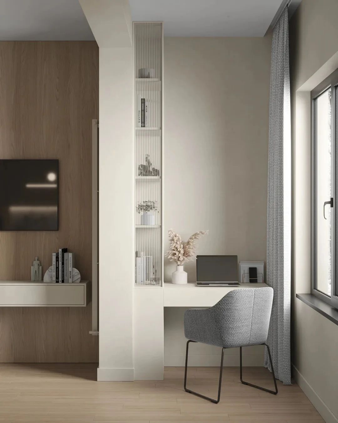 客厅中,设计师选用白色与原木色作为空间的主色调,搭配上简洁的灰色,营造现代极简主义下的温柔居所,浅灰色的小型布艺沙发搭配上白色大理石台面的小茶几,不同材质的搭配丰富了空间的细节,客厅虽小,但满足了屋主待客、交谈与休闲的功能,兼具美观性与实用性。