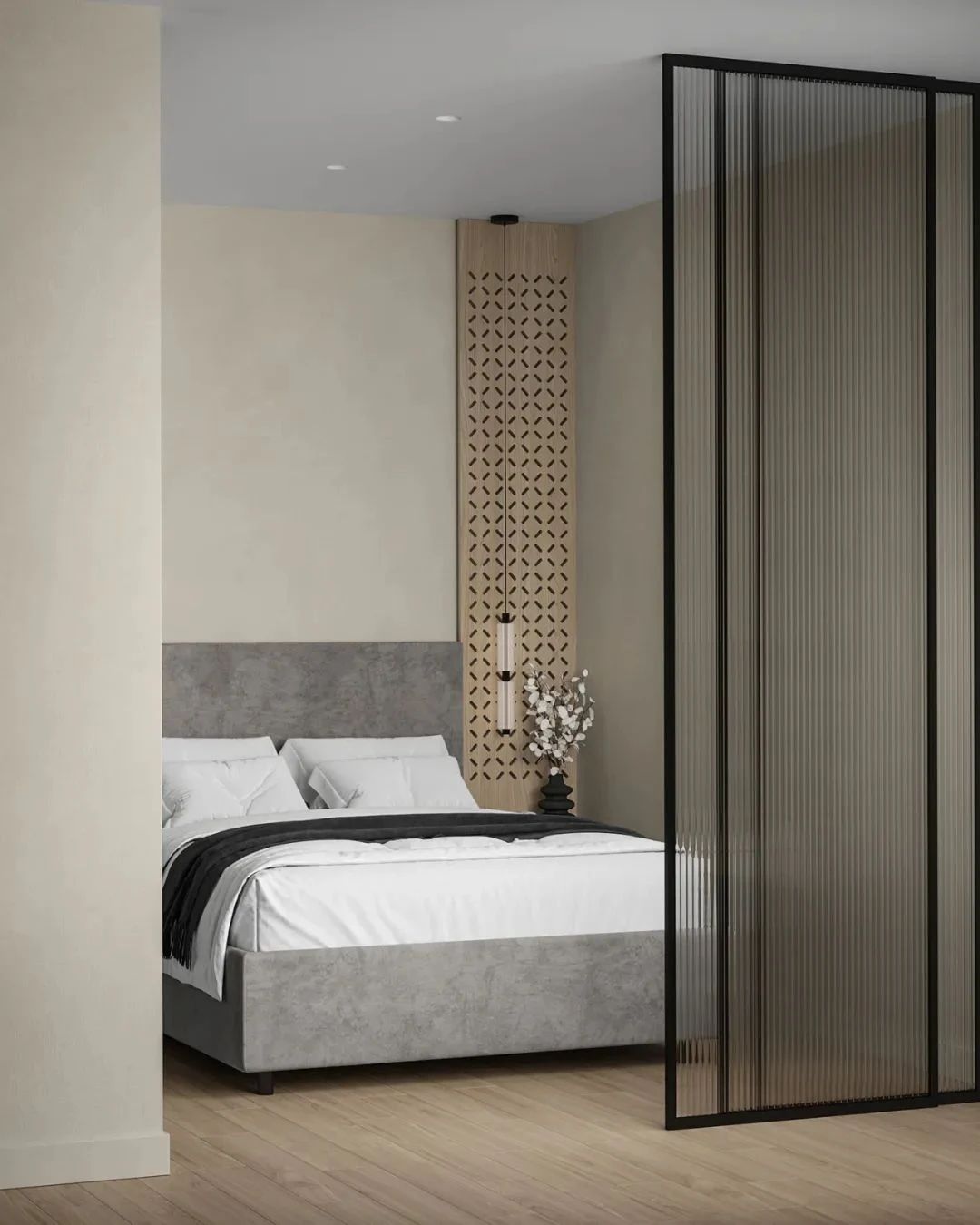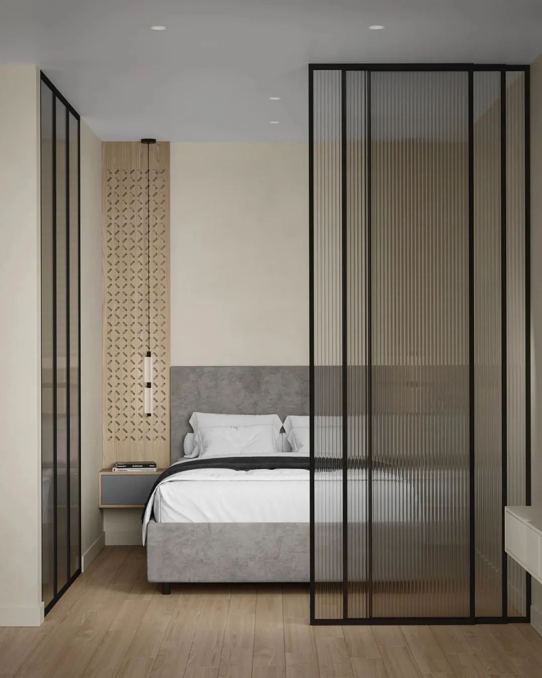 卧室之中,设计师采用了黑色金属边框的玻璃门,既分隔了空间又保证了空间中拥有充足的自然光线,给人明亮的视觉感受,白色的床品柔软蓬松,营造出了一个舒适的休憩空间。造型简洁的床头灯展现出现代极简主义下的写意美感。