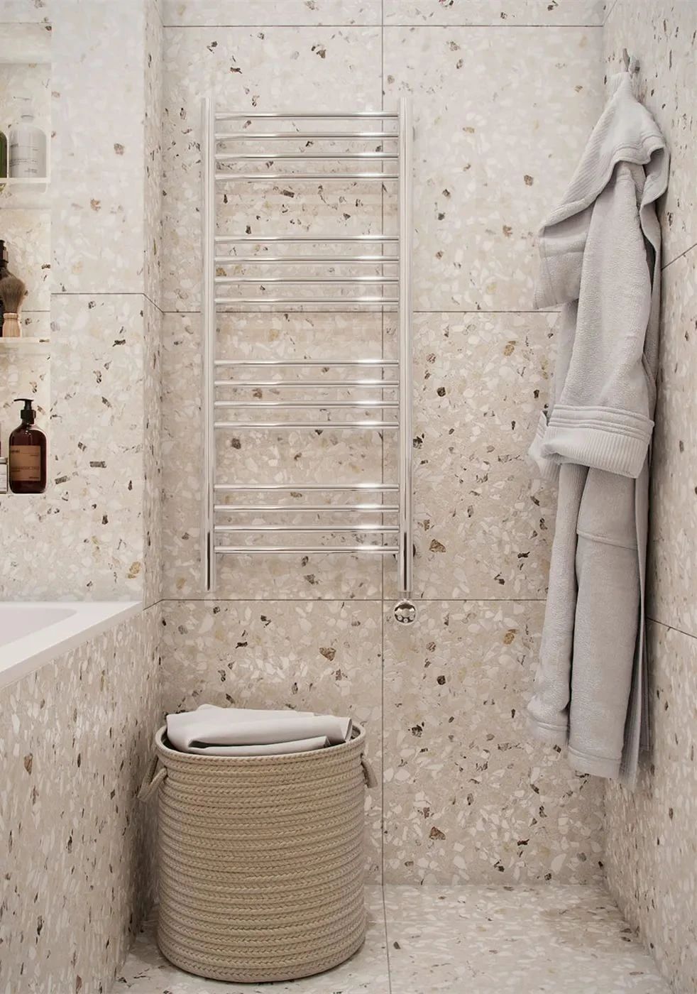 浴室利用水磨石作为铺垫,大理石搭建的洗漱台看起来大气有格调。利用干草植物和藤编织物的收纳筐用来点缀室内,显得整体既清新又治愈。