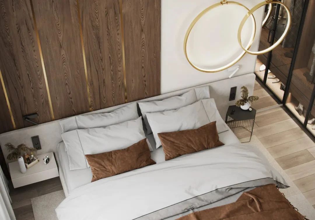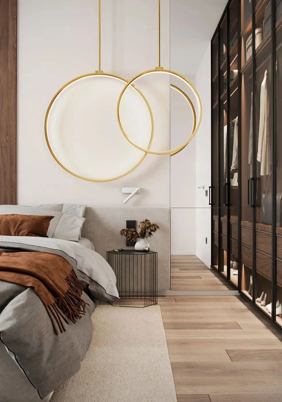 跳脱的橙色在浅灰卧室中显得格外活跃,墙上两盏圆润细致的弧形灯管将室内烘托出一股浪漫的氛围。