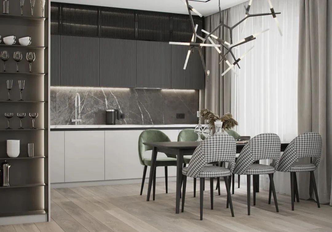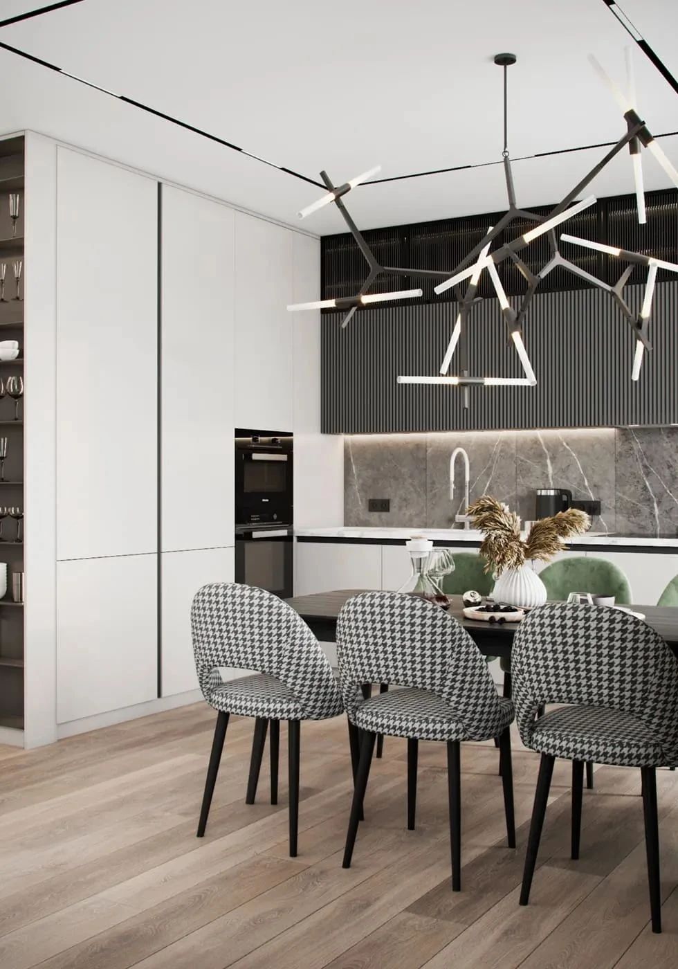 客厅和厨房、餐厅一体化的设计,让整个视觉空间看起来更加宽广。餐桌上方造型感十足的灯饰成为了整个空间的亮点,相互交错的时尚设计带来强烈的视觉效果。