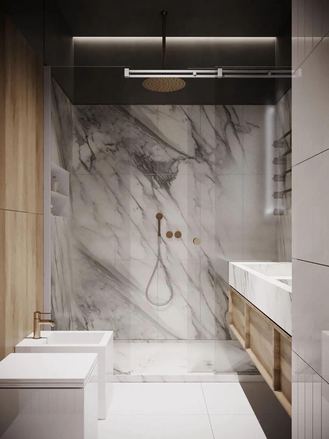 卫生间中,设计师选用白色与木色作为空间的主色调,营造柔和的空间氛围。白色大理石洗手台赋予空间轻奢气息,对称式的双台盆设计,美观大方。