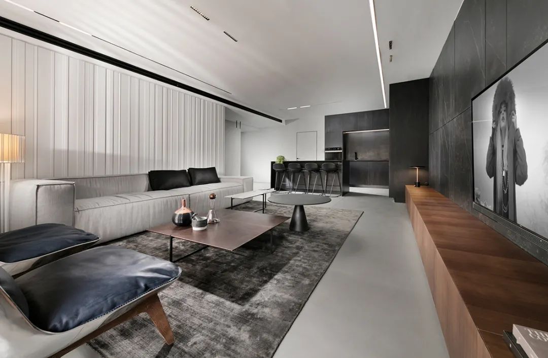 公寓的整体依旧是采用高级灰配色,低饱和度的色彩搭配营造了一种高压绚烂的空间气质,简单的配色贯穿于空间中,使得空间的整体性更强。